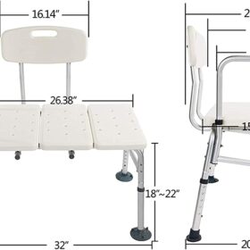 Bath Transfer Benches are specially designed seats that make getting in and out of the bathtub safer and easier. These benches extend over the edge of the tub, creating a stable, level surface for a smooth and secure transfer. With height adjustments on both sides, they ensure balance and comfort for various tub heights. A built-in support handle offers added stability while moving across the bench and into or out of the bathtub, making them ideal for individuals with limited mobility or those recovering from injury.