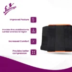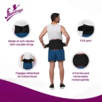 Made of soft elastic with double strap for better compression and proper fitment. EVA pad at the back to support lumbar region. 4 Contoured removable metal splints at the back gives perfect spine support. Flapper attached to Velcro hook for ease in usage.