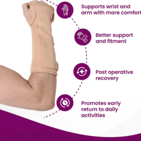 - Product Description 10.5“ Long Foam laminated fabric to support wrist and arm with more comfort and cushioning effect. Metal splint with pocket on top and bottom to immobilizing wrist on right or left hand. Lycra fabric inside for better support and fitment. Anatomical thumb opening with extra foam padding for better fitment and comfort. Common for left and right.