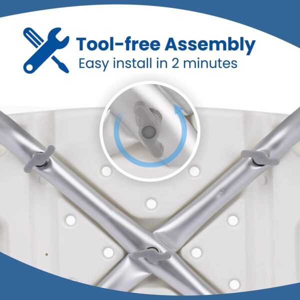 Tool-Free Assembly: Quick and easy to set up with no tools required. The chair features a wide, comfortable seat and is compatible with nearly all bathtub styles.