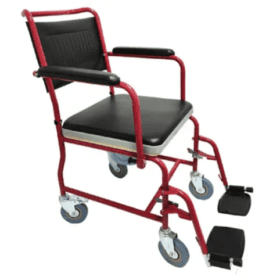 Shower Mobile Commode Chair Movable For Toilet with durable chrome-plated carbon steel frame comes with a comfortable, removable upholstered seat and a removable plastic toilet seat with cover and 5-inch wheels.