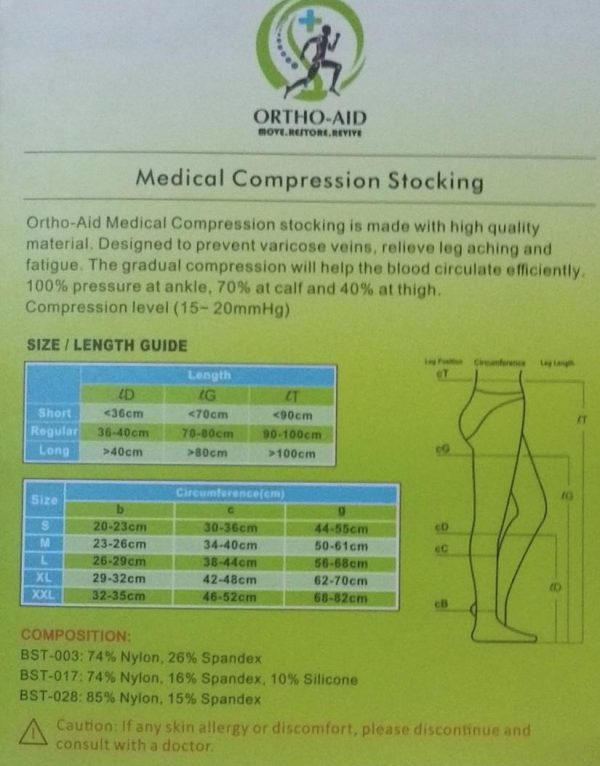 A variety of stocking types and compression class to meet different demand:* Pantyhose/ Thigh High/ Under Knee* Open toes/ Close toes* Compression: 15~20mmHg/ 20~30mmHg/ 30~40mmH
