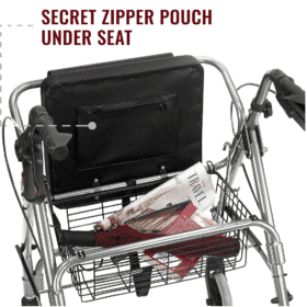 This four-wheeled rollator also features a comfortable padded seat and back for taking a well-earned rest if you need. The seat flips up so you can place things in the handy bag below.