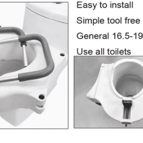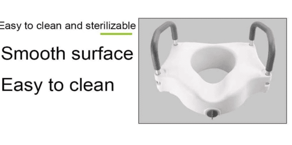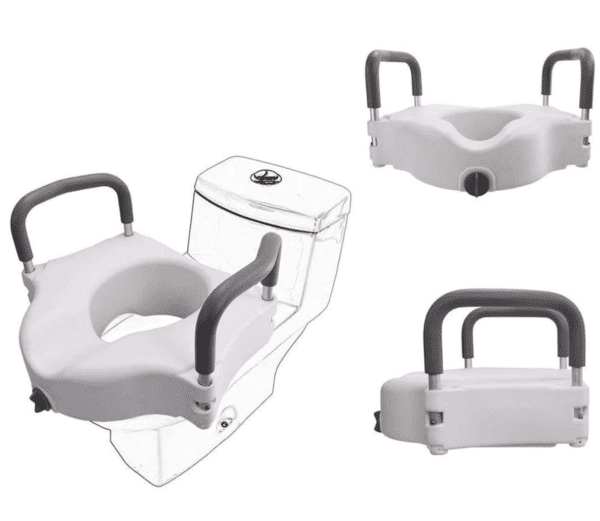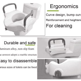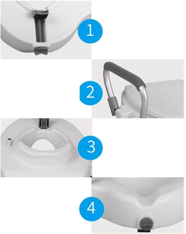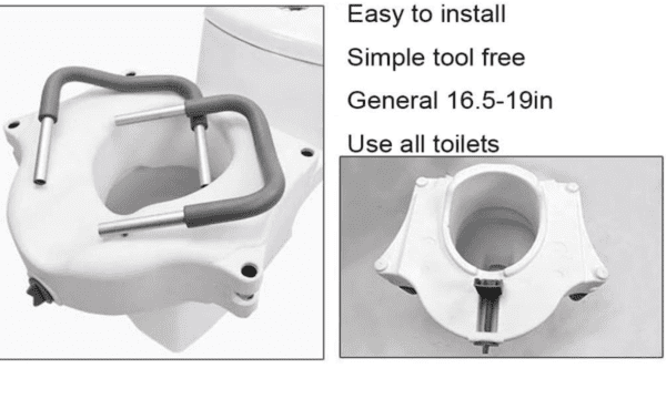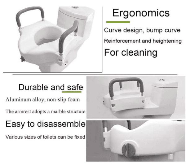 By increasing the height of the toilet, and by providing extra support, sitting down and getting up becomes easier and safer for the user. If desired, it is possible to sit on a standard toilet seat. It can also be used without the toilet seat providing a seat height increased by 60 mm, 100 mm or 140 mm. Toilet raiser with armrests is an easy and convenient means of making the existing toilet suitable for a safe situation again.