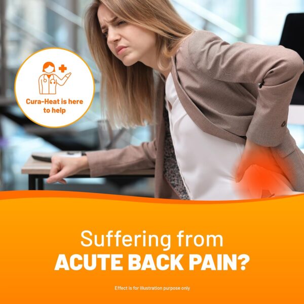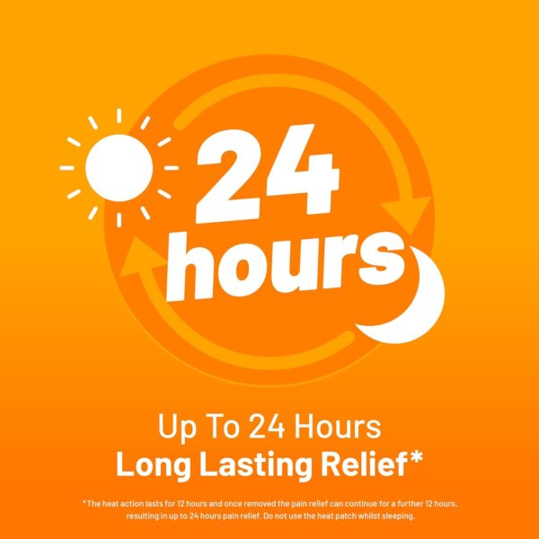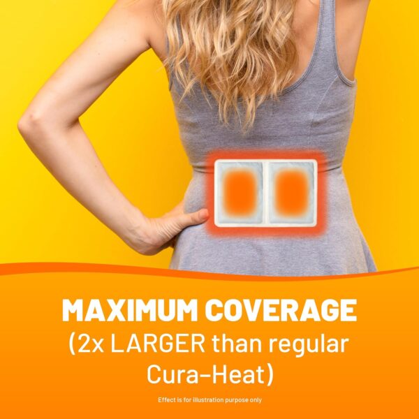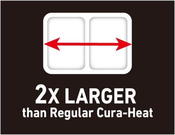 Cura-Heat Back Pain Max Size’s heat action lasts for 12 hours and once removed the pain relief can continue for a further 12 hours resulting in up to 24 hours pain relief. Cura-Heat Back Pain Max Size are twice the size of regular Cura-Heat Back & Shoulder Pain and cover a larger area of the lower back, making them suitable for people who desire warming relief over a larger area and may suffer from acute back pain.