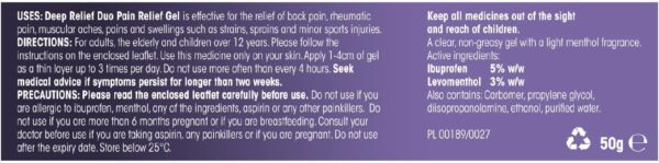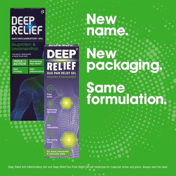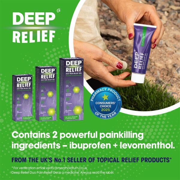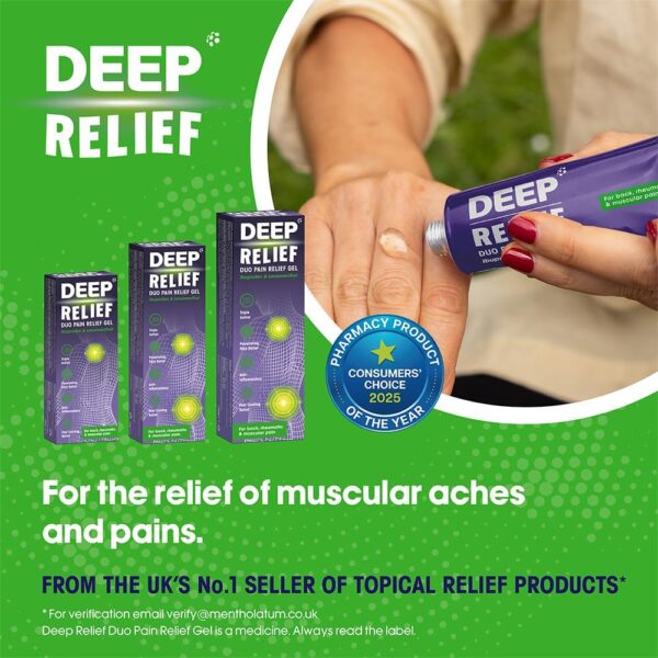 Deep Relief Duo Pain Relief Gel is designed for fast, targeted relief of pain and inflammation. It starts working within 10 minutes, providing cooling comfort for: