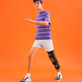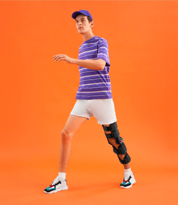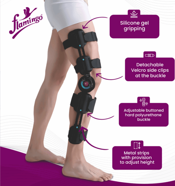 Vertical sturdy and durable metal strip along side with range of motion controller dial. Metal strips with provision to adjust height. Hard polyurethane height adjustable buckle with button to ensure desire height. Removable side clips at the buckle with Velcro receptive fabric. Foam padding at inner side of each buckle. Silicone gel gripping at below knee foam padding.
