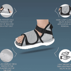 - Rocker sole of the cast shoe deloads the ankle joint enhances the ease of walking on foot cast restores the normal gait. It improves the balance of patients on foot cast and helps in early ambulation. It is extremely light in weight, colorful, and aesthetically pleasing.