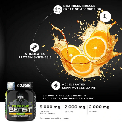 Unleash your power with USN® Creatine Beast, a scientifically formulated performance booster designed to fuel your workouts. Packed with Creatine Monohydrate, this powerful blend supports muscle strength, endurance, and rapid recovery.