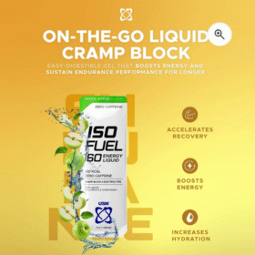 Convenient on-the-go liquid cramp block isotonic gel that replenishes electrolytes and provides energy.